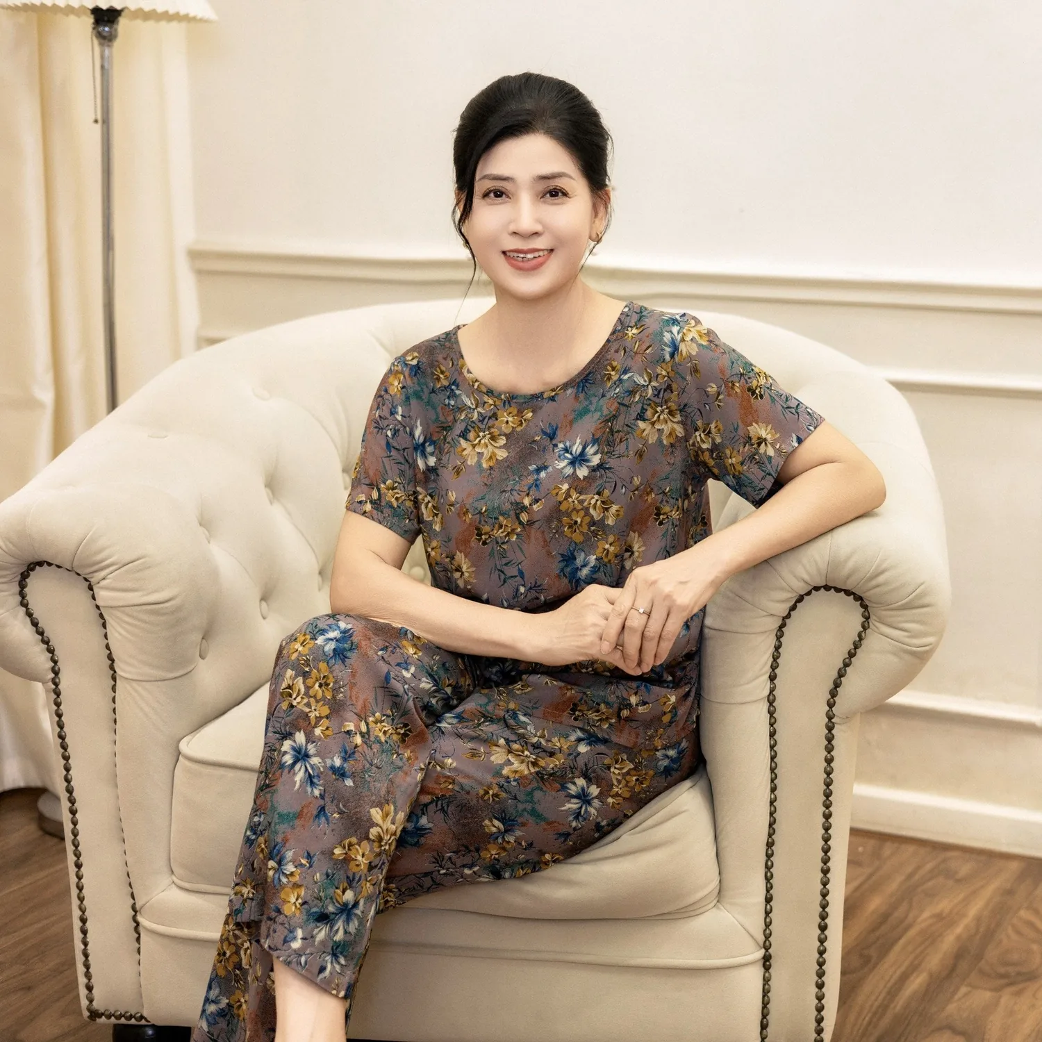 - Thiết kế hoa lá tạo cảm giác sang trọng nhưng vẫn gần gũi, phù hợp mặc nhà hoặc dạo phố nhẹ nhàng.