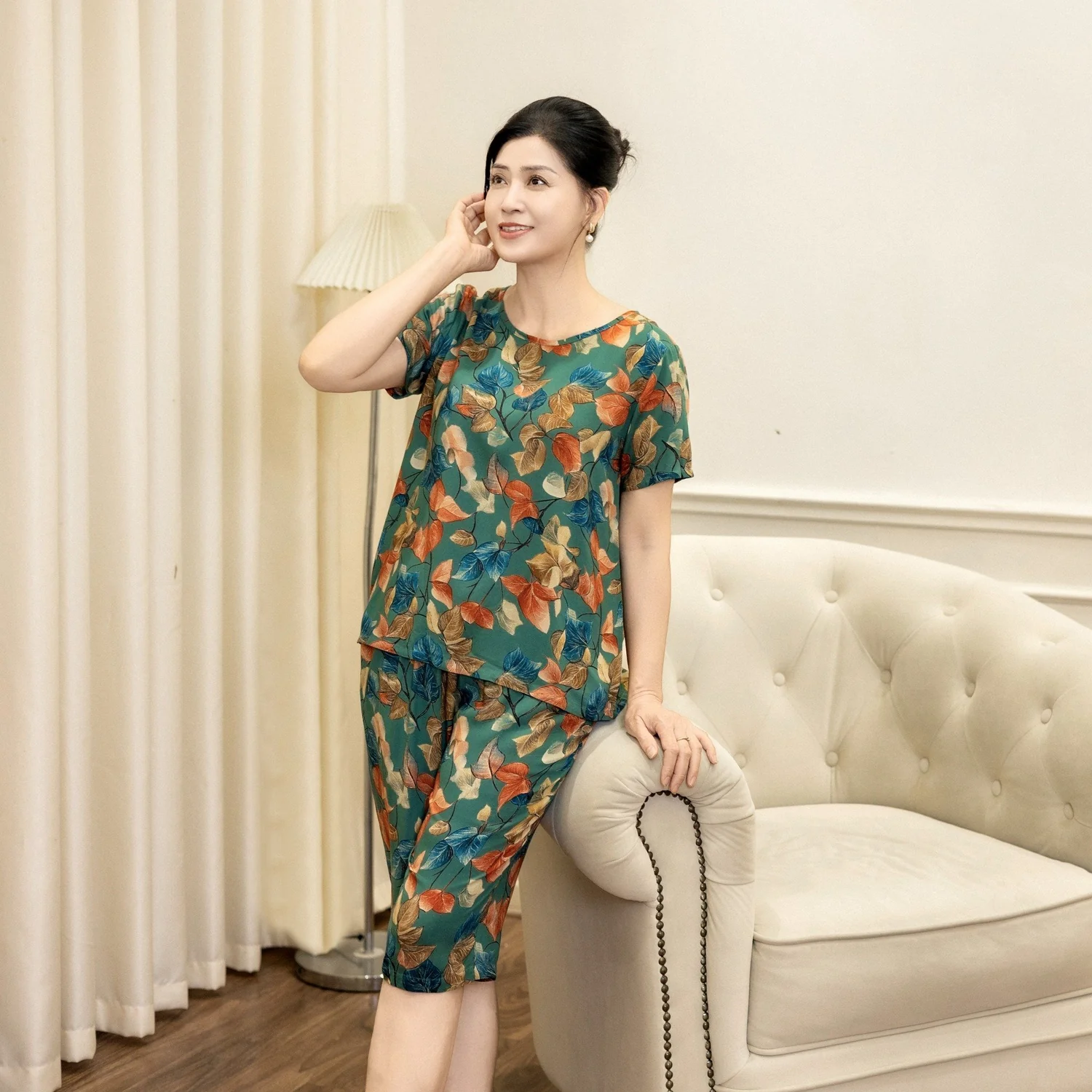 - Thiết kế hoa lá thanh lịch cùng tông màu nhã nhặn, tôn da, phù hợp mặc nhà hoặc dạo phố nhẹ nhàng.